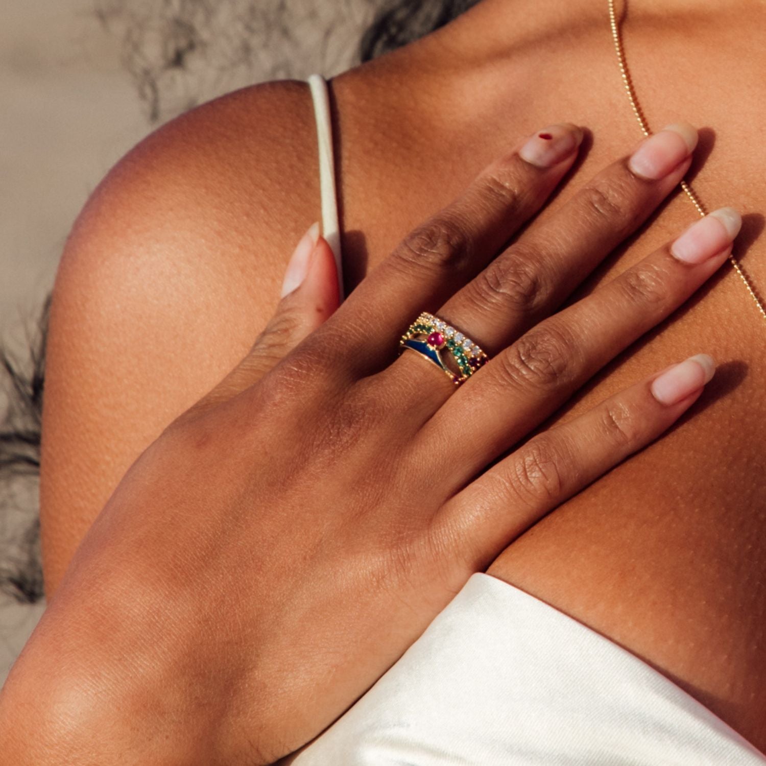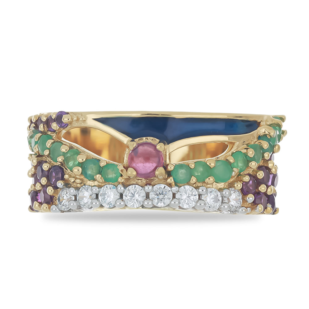In crafting the Aurora ring, we've masterfully merged a spectrum of colours and an array of stones to provide you with a captivating glimpse of the Aurora, that awe-inspiring natural phenomenon. Just like the mesmerising sight of the Aurora, this ring is nothing short of magical. As you wear this ring, it's our hope that you feel transported to the enchanting world of dancing lights in the night sky.