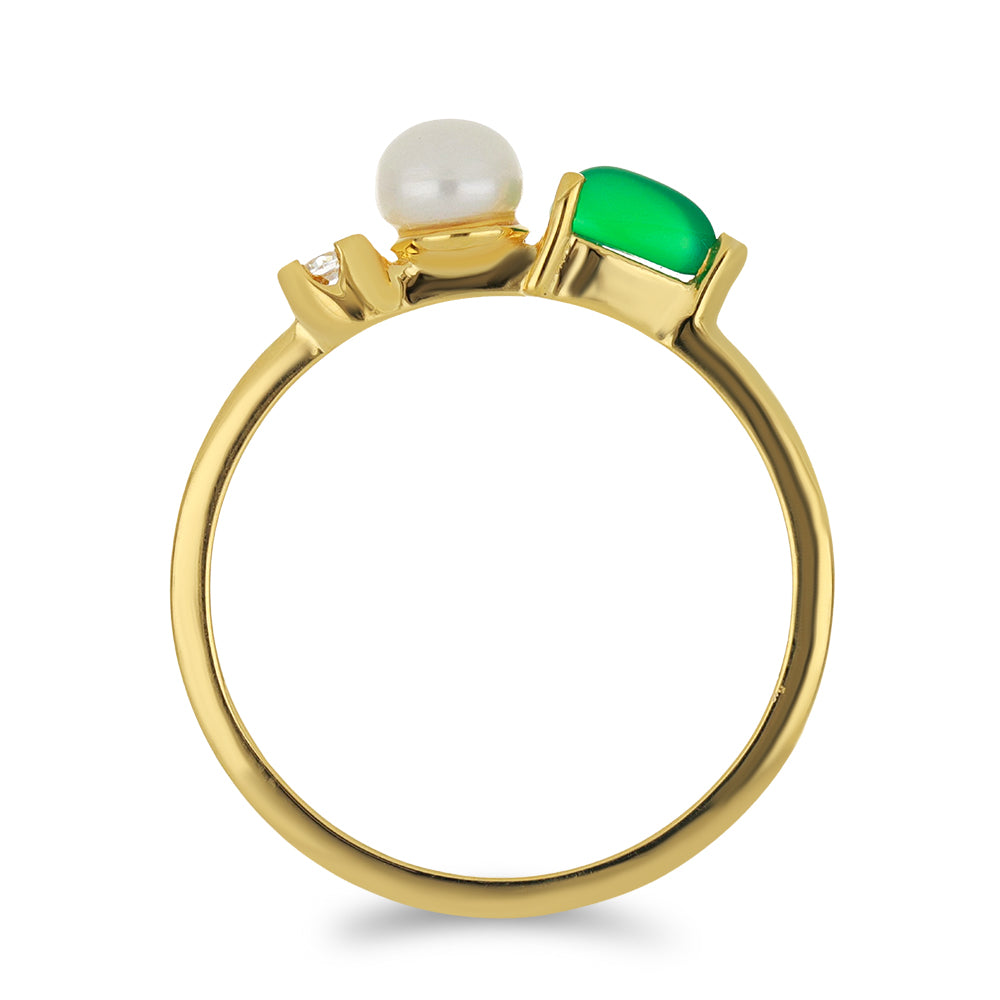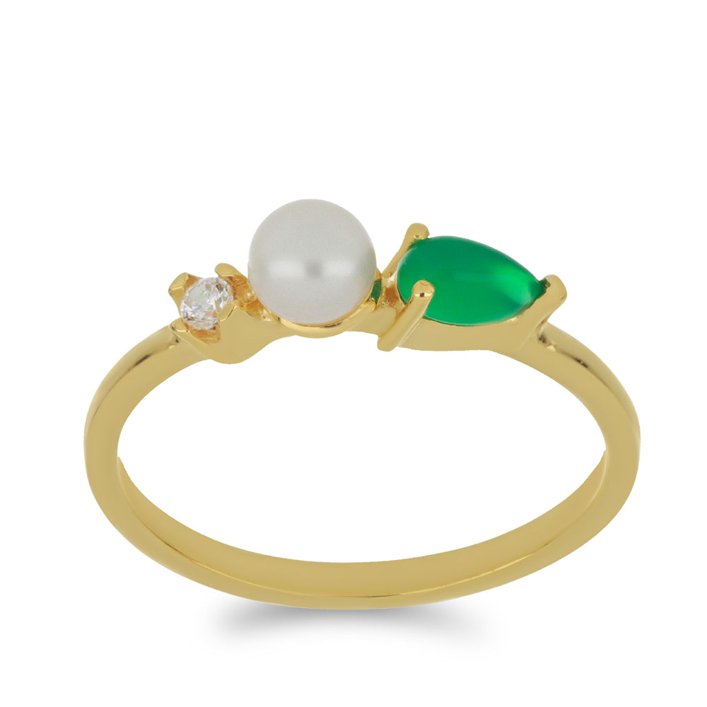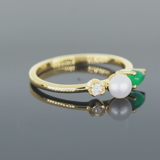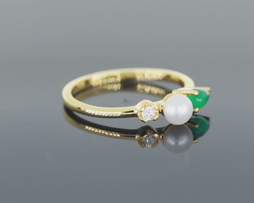 Just as the star and moon light our path through the night, this ring symbolises the wisdom and inspiration that help us focus our efforts in the right places. The green agate stone signifies growth, the white pearl represents purity, and the CZ stones add brilliance to our choices.